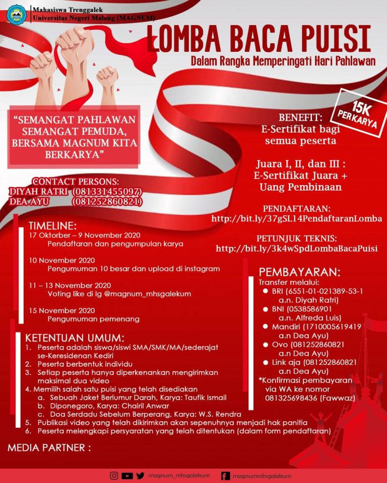 1 min read BERITA SMA NEGERI 2 TRENGGALEK RAIH JUARA 1 LOMBA BACA PUISI TINGKAT SMA/ SMK/ MA SE-EKS KARESIDENAN KEDIRI 2020 17 November 2020 SMA Negeri 2 Trenggalek berhasil meraih juara 1 dalam lomba baca puisi tingkat SMA/SMK/MA...Read More