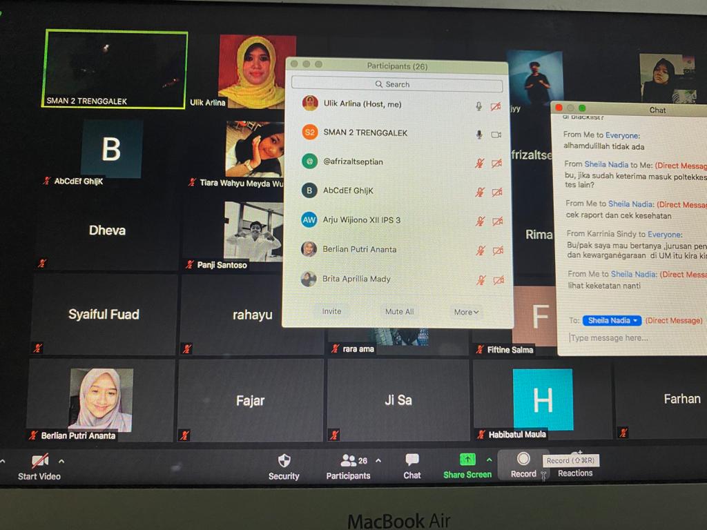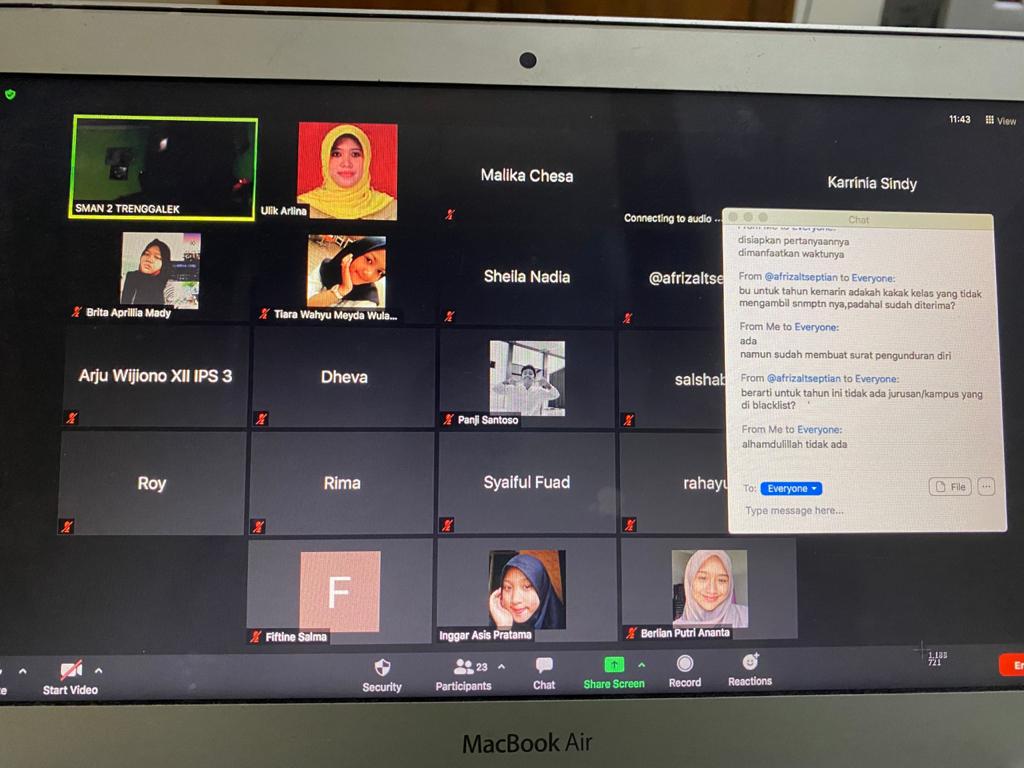 “Tahun ini sangat berbeda dengan sebelumnya. Proses pendampingan untuk mendapatkan perguruan tinggi yang diinginkan siswa membutuhkan kesabaran dan strategi khusus. Karena semua harus dilaksanakan secara daring,” ujar ibu Ulik Arlina. S.Psi., koordinator guru BK SMA Negeri 2 Trenggalek.